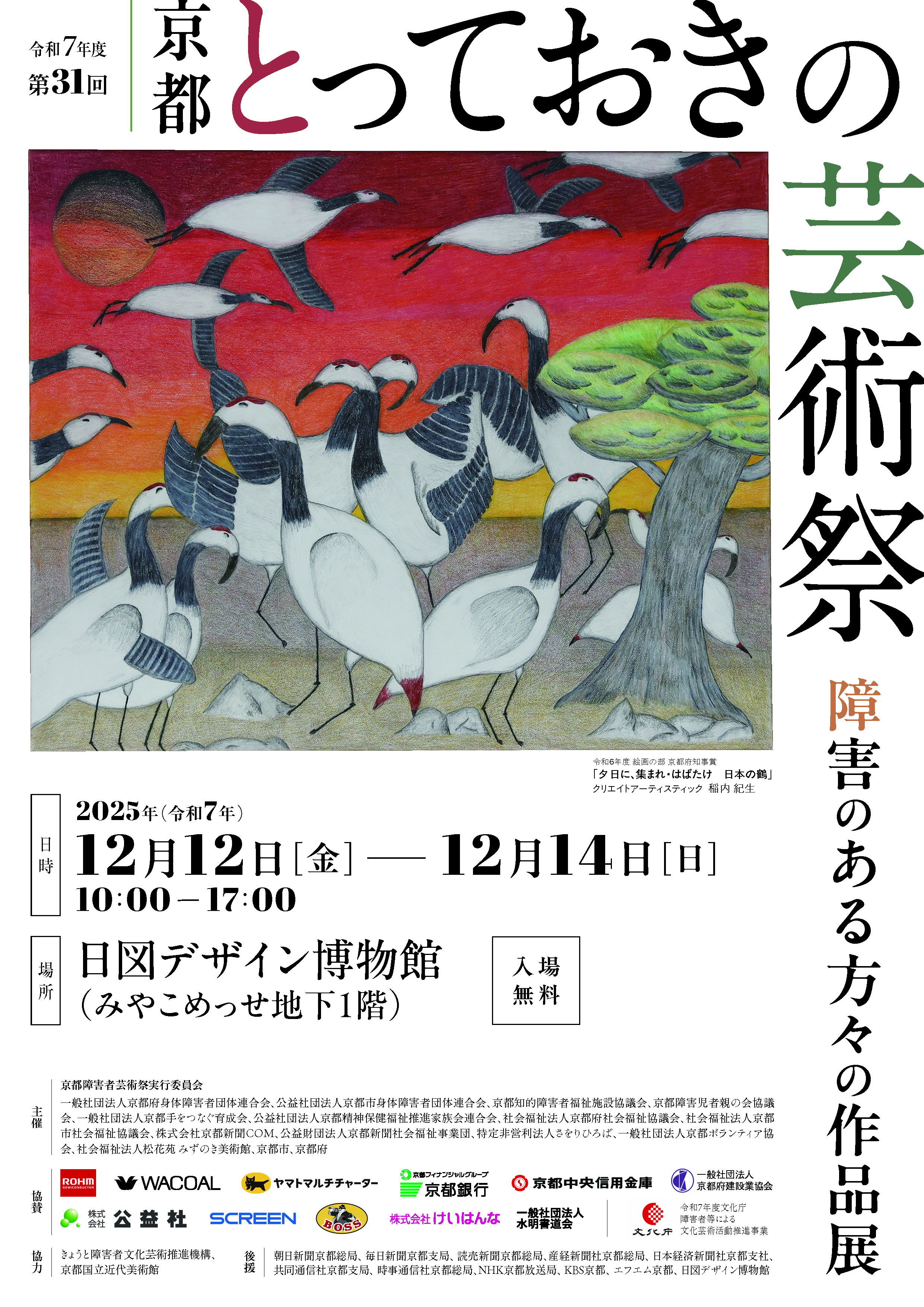 公益社は障害のある方々の作品展「京都とっておきの芸術祭」に協賛しています。 この展示会は、障害がある方々の芸術活動を支援し、社会参加の促進を図るため、平成7年度から開催されており、今回で31回目になります。 京都府にお住まいの障害のある方々による絵画、陶芸、写真、書、俳句、川柳、諸工芸が展示されます。 入場は無料です。 多くの方に会場へ足を運んでいただきたいと思います。 詳しくは京都府ホームページでご確認ください。